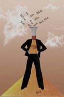 Surrealistisch beeld van een persoon met megafoon als hoofd. Er wordt tegenwoordig veel gezegd maar of het meeste zinnig is, is nog maar de vraag. Lange verhalen, onzinnig gezwets en onduidelijk geklets. Kortom veel geblaat en weinig wol. Efficïenter communiceren zou veel tijd en ergernis besparen. Wellicht leuk voor op kantoor ter herinnering dat er niet eindeloos vergaderd moet worden.