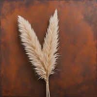 Beeld je in: delicate pluimen van pampusgras die zacht dansen in contrast met een robuuste, geoxideerde roestige achtergrond. De warme aardetinten van het roest versterken het zachte beige van het gras, wat een perfecte balans tussen rauwheid en sereniteit creëert. Dit werk is een ode aan de kracht van vergankelijkheid en de schoonheid in textuur. Een harmonie van natuur en verwering, ideaal voor liefhebbers van rustieke en organische kunst.