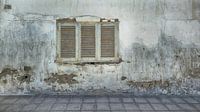 De muur stond er alsof hij niets hoefde te bewijzen. Afgebladderd wit, aders van scheuren die langzaam hun eigen weg hadden gekozen. Het houten luik hing er een beetje scheef bij, verweerd door zout en wind, met roestplekken die verrieden dat tijd hier geen vijand was maar een medebewoner.
