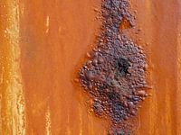 Metalen oppervlak met een oranje coating die roest bij het ouder worden. Warme kleurtonen.