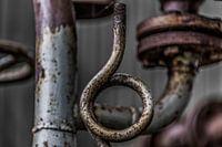 Roestig metaal aan een installatie met afsluiters, in een oude verlaten fabriek in Nederland.