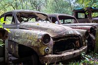 Dit is een foto van een verlaten auto die enorm aan het roesten is. De auto maakt onderdeel uit van een privé verzameling van iemand die verschillende merken en modellen in zijn tuin heeft staan. Ooit gekocht vanwege de onderdelen. Inmiddels overgeleverd aan de natuur.