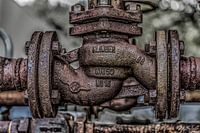 Roestige installatie van afsluiters in een verlaten fabriek in Nederland.