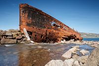Een oude haringvis boot geheel verroest ligt aan de kant van het plaatsje Djupavik in IJsland. De boot ligt op een plaats waar vroeger een haringfabriek stond.