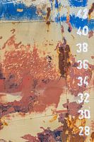 In dit beeld zie je diverse verflagen in bruin, geel en blauw tinten, aangevuld met witte cijfers. Welke de diepgang van het schip aangeven. Ook de lasnaden zijn goed zichtbaar en lopen horizontaal en verticaal door het beeld. De roestplekken geven dit beeld karakter en zijn mooi verspreid over het beeld.