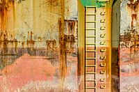 Een kleurrijke compositie op de romp van een werkschip dat afgemeerd lag in de Waalhaven in Rotterdam. De roestvlekken nemen de bruinrode tinten voor hun rekening; daarnaast zijn er roze en grijze vlakken en zelfs wat accenten in groen en wit. Het laddertje en de handgrepen ernaast brengen dan weer de kleur geel in.