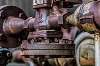 Roestige onderdelen van een afsluiterinstallatie, verweerd door de weersinvloeden, in een verlaten fabriek in Nederland.