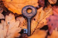 Roestige sleutel tussen herfstbladeren van Art & Soul Creations
