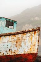 Een roestige boot die verhalen vertelt van stormachtige avonturen in mistig water. De zachte blauwe en roestrode tinten creëren een nostalgische sfeer. Ideaal voor de woonkamer om een rustige, ontspannen sfeer te creëren met maritieme accenten en de verbeelding mee te nemen op reizen over de horizon.