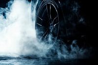 Een krachtig spel van licht en schaduw ontvouwt zich als de band wordt ontrold in een mysterieuze mistwolk. Het dynamische tafereel straalt energie en beweging uit, perfect voor een moderne garage of een sportieve woonkamer of studeerkamer. De passie voor snelheid en prestaties komt hier tot leven.