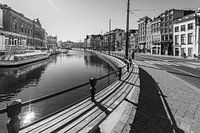 Rokin straat en gracht in Amsterdam tijdens een zonnige ochtend. De straat is leeg en verlaten en er is geen verkeer op straat vanwege de COVID-19 pandemische corona virus lockdown die een spookstad sfeer geeft aan de foto.