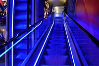 Winkelen met mijn dochter op de Kurfürstendamm in Berlijn, Duitsland betekende de ene winkel na de andere binnengaan. Ik maakte er het beste van door rond te kijken voor wat leuke fotomomenten. Deze roltrap in de Desigual-winkel trok mijn aandacht omdat ik hield van de kleur en de lichtere lijnen.
