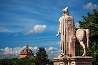 Ein Blick vom römischen Kapitol auf die Statue des Dioskuren Kastor und die Kuppel der Jesuskirche Il Gesù.