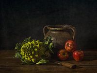 Een stilleven met Romanesco bloemkool, een oude aardewerk pot, rode appels en een oud mes op een houten tafel tegen een donkere achtergrond. In de stijl van de Oude Meesters.