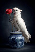 Een witte papegaai zit statig op een Delfts blauwe porseleinen vaas en houdt een rode roos vast alsof hij een dramatische liefdesverklaring voorbereidt. Elegant én hilarisch.