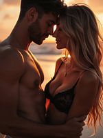 Een romantisch beeld van twee geliefde aan het strand met ondergaande zon.