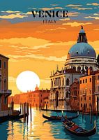 Een adembenemende illustratie van Venetië bij zonsondergang, met gondels die door het Canal Grande glijden en de iconische Basilica di Santa Maria della Salute. De warme kleuren van de lucht en het water creëren een romantische en tijdloze sfeer. Ideaal voor bewonderaars van de Italiaanse cultuur en schilderachtige kunst.