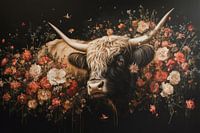 Deze elegante afbeelding toont een imposante Schotse hooglander koe omgeven door een overvloed aan rozen in zachte crème- en warme rozetinten. De combinatie van de delicate bloemen en de robuuste hoorns van de koe creëert een prachtig contrast, terwijl de donkere achtergrond de kleuren van de bloemen extra doet stralen. De compositie ademt een gevoel van romantiek en verfijning, ideaal voor liefhebbers van natuur, dieren en bloemrijke kunst. Dit werk voegt een vleugje tijdloze schoonheid toe aan elk interieur.