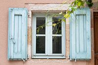 Zuid-Frankrijk in een notendop. Gevangen in een raam in Millau, net voordat de zon de kleuren van de muur en de luiken laat verdwijnen. Sfeer in een eenvoudig beeld.