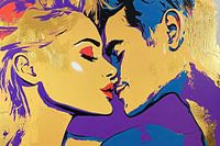 Romantiek - Dit is een romantisch schilderij van een jonge man en vrouw die elkaar bijna kussen, uitgevoerd in opvallende pop-art stijl met levendige primaire kleuren zoals blauw en geel, en accenten in goud en paars.