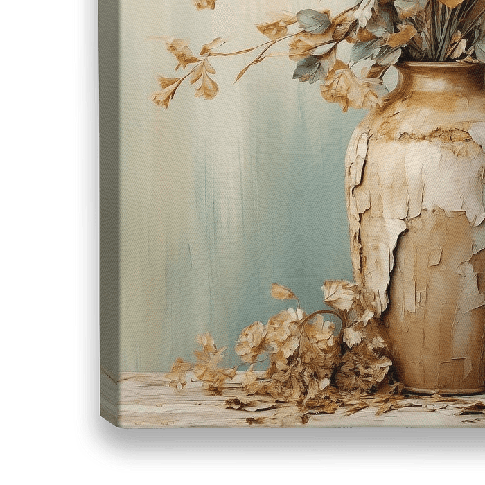 In dit betoverende schilderij komt de romantiek tot leven door de gracieuze compositie van een eenvoudige vervallen oude keramieken vaas, die trots het middelpunt van de afbeelding inneemt. De vaas, met zachte kleurschakeringen, straalt een tijdloze elegantie uit. Binnenin rust een weelderig boeket van goudgele en zachtbeige bloemen, zorgvuldig gearrangeerd met een artistieke gevoeligheid.