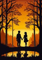 Twee figuren, een man en een vrouw, staan in het midden van de compositie tegen een achtergrond van een gouden zonsondergang. Ze zijn gesilhoueteerd, donker tegen de warme, oranje-gele en amberkleurige tinten van de lucht en de bomen. De jurk van de vrouw en de jas van de man zijn zichtbaar, waardoor de esthetiek van het silhouet behouden blijft. Ze houden elkaars hand vast en lijken verwikkeld in een teder moment. Hun figuren worden weerspiegeld in een stilstaand waterlichaam beneden, wat bijdraagt aan de serene sfeer. De kleuren in het water zijn weerspiegelingen van de lucht erboven, wat een harmonieus visueel effect creëert.