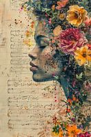 Trefwoorden: bloemenportret schilderij, kleurrijke collage kunst, vrouw met bloemen schilderij, muzikale kunstwand decoratie, bohemian wanddecoratie, romantisch schilderij woonkamer, modern chic kunstwerk, kleurrijk portret met bloemen, schilderij slaapkamer vrouw, Japandi collage schilderij