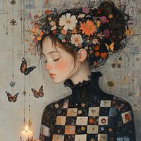 Romantisch Portret Bloemige Krans - Op dit bloemen vrouw schilderij zie je een jonge vrouw met gesloten ogen, wiens hoofd omringd is door een weelderige krans van kleurrijke bloemen, terwijl vlinders zachtjes rond haar zweven, tegen een achtergrond met een vleugje kaarslicht en rustieke houttextuur.