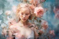 Dromerig portret van een vrouw omringd door roze rozen in zachte pasteltinten. Een poëtisch en etherisch kunstwerk dat rust, romantiek en zachtheid brengt in elk interieur. Portret van een vrouw, in de stijl van de romantische school. Tijdloos, geeft meteen zachtheid aan de ruimte. Mooi in groot formaat.