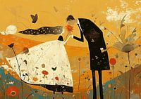 Romantisch Schilderij - Dit figuratieve schilderij toont een liefdevol paar, een man en een vrouw in abstracte vormen, verenigd in een romantisch tafereel met bloemen en vlinders tegen een warme, oranje achtergrond.
