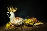 Romantisch , warm stilleven met brood en weegschaal ,granaatappel ,salami, en een glas rode wijn