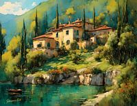 Een serene scène aan een meer met een statig huis tussen weelderig groen en hoge cipressen. Een kleine houten boot drijft zachtjes op het kalme water en weerspiegelt de rustige sfeer van het landschap.
