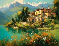 Een rustiek huis met twee verdiepingen ligt sereen aan een rustig meer, omringd door weelderig groen en kleurrijke wilde bloemen. Op de achtergrond rijzen majestueuze bergen op onder een heldere hemel, wat bijdraagt aan de rustige schoonheid van het tafereel.