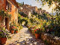 Stap binnen in de zonovergoten charme van een Italiaans dorpje met Italian Afternoon Glow. Een geplaveid pad slingert zich gracieus door het hart van het dorp, omzoomd door oude okerkleurige gebouwen met terracotta daken. Levendige groene luiken omlijsten ramen die overladen zijn met bloemen, terwijl klimplanten en elegante cipressen…
