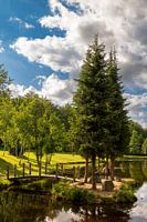 Een houten brug leidt naar een klein eiland waar twee bankjes bezoekers uitnodigen om te blijven hangen.