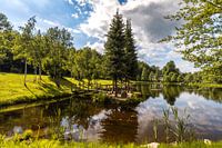 Een houten brug leidt naar een klein eiland waar twee bankjes bezoekers uitnodigen om te blijven hangen.