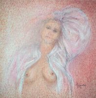 De schoonheid van een jong meisjeslichaam getekend met pastelkrijt op gedessineerd roze papier.