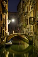 Een romantisch steegje in het centrum van de lagunestad Venetië in Italië bij nacht. Een enkele lantaarn verlicht een boot en een kleine brug over een kanaal dat uitmondt in het Canal Grande een paar straten verderop.