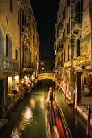 De lagunestad Venetië in Italië in de avond. Romantisch steegje met restaurantje aan een kanaal en passerende gondel. De nacht is al gevallen en de eerste sterren zijn te zien aan de nachtelijke hemel.