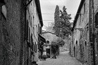 Zwart-witfoto van een steegje in het historische centrum van Volterra. Gezicht op een van de oude charmante huizen tegen een muur. Voor het huis staat een kleine boom. Achter het huis rijst een grote cipresboom de lucht in. Voor mij is Volterra een van de mooiste steden van Toscane.