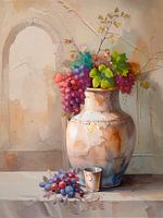 Het kleurenpalet is zacht en gedempt, met overwegend aardse tinten: gebroken wit, zachte grijzen, beige, en subtiele nuances van geel en bruin in het fruit en de vaas rechts.