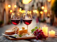 Romantisch stilleven met wijn, kaas, stokbrood. Daarnaast branden nog enkele kaarsjes. Dit stilleven staat om een tafeltje in een Italiaans straatje.