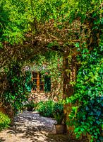Romantische mening van tuinterras met mooie bloemen en groene installaties, Mallorca, Balearen, Balearenzee, Middellandse Zee, Spanje