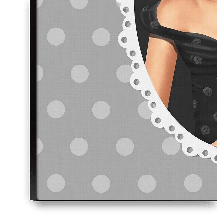 Mooie vrouw met hoed, romantisch ingelijst op grijs met stippen.