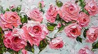 De kunstenaar heeft verschillende tinten roze gebruikt, van zacht pastel tot diep fuchsia, om de gelaagdheid en de complexiteit van de bloemblaadjes te benadrukken. Groene bladtonen bieden een levendig contrast en brengen de florale compositie tot leven. De dik aangebrachte verf creëert een dynamisch en bijna tastbaar oppervlak dat de kijker uitnodigt dichterbij te komen en de details te verkennen. Het licht lijkt van binnenuit de bloemen te komen, waardoor elke roos een eigen karakter en diepte krijgt. Dit schilderij straalt een zachte, romantische sfeer uit en zou in elk interieur een vleugje natuurlijke elegantie brengen.