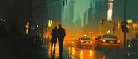 Tegen een levendige stedelijke achtergrond, gedrenkt in mistig licht en zachte weerspiegelingen, flaneren twee silhouetten hand in hand. De zachte gloed van de met regen doordrenkte straat en de glinsterende taxilichten creëren een romantische sfeer. Deze scène brengt leven en warmte in elke woonkamer, perfect voor een knus hoekje vol herinneringen.