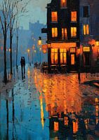Olieverfschilderij van een avondlijke straatscène in Parijs met natte bestrating die het licht van de cafés weerkaatst. Een stel loopt hand in hand langs een gezellig café met oranje verlichting, terwijl een andere persoon ervoor staat. De lucht is zachtblauw en contrasteert harmonieus met de stedelijke architectuur. De scène legt sfeervolle, romantische momenten van het stadsleven vast in een klassieke schilderstijl en brengt warmte, intimiteit en de charmante flair van de stad van de liefde over.