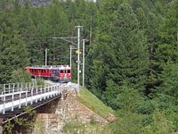Romantische bergtrein komt de hoek om, uit het bos. Bijna over het spoorviaduct valt de rode trein mooi op in het groene woud.