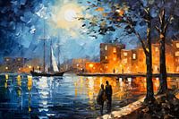 Het motief toont een romantische lichtsfeer aan een haven met uitzicht op een zeilschip dat schittert in het maanlicht. De lichten van de foto zijn bijzonder kleurintensief.