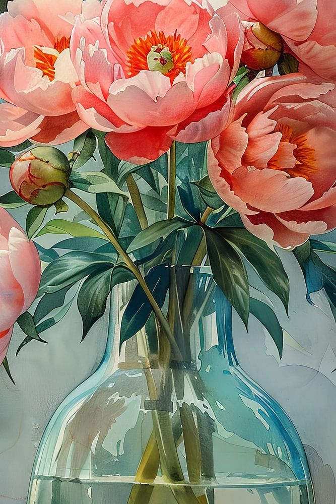 Een elegant display van roze pioenrozen in een vaas van helder glas, perfect voor een stijlvol interieur.
